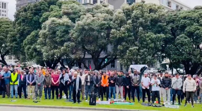 ولنگٹن  ( نیوزی لینڈ) عارف الحق عارف نمائندہ خصوصی ‎اسلامک سرکل آف آوتیورا ( نیوزی لینڈ)، اسلامک انٹرنیشل ایسویشن نیوزی لینڈ (ایمان) اور فلسطین سولڈریٹی نیٹ ورک نیوزی لینڈ کے زیر ایتمام ہفتے والے دن نیوزی لینڈ کے مرکزی شہر ویلینگٹن میں ہفتے کے روز پارلیمنٹ کی بلڈنگ کے سامنے فلسطین اور غزہ  پر اسرائیلی مظالم کے خلاف بہت بڑا مظاہرہ ہوا۔